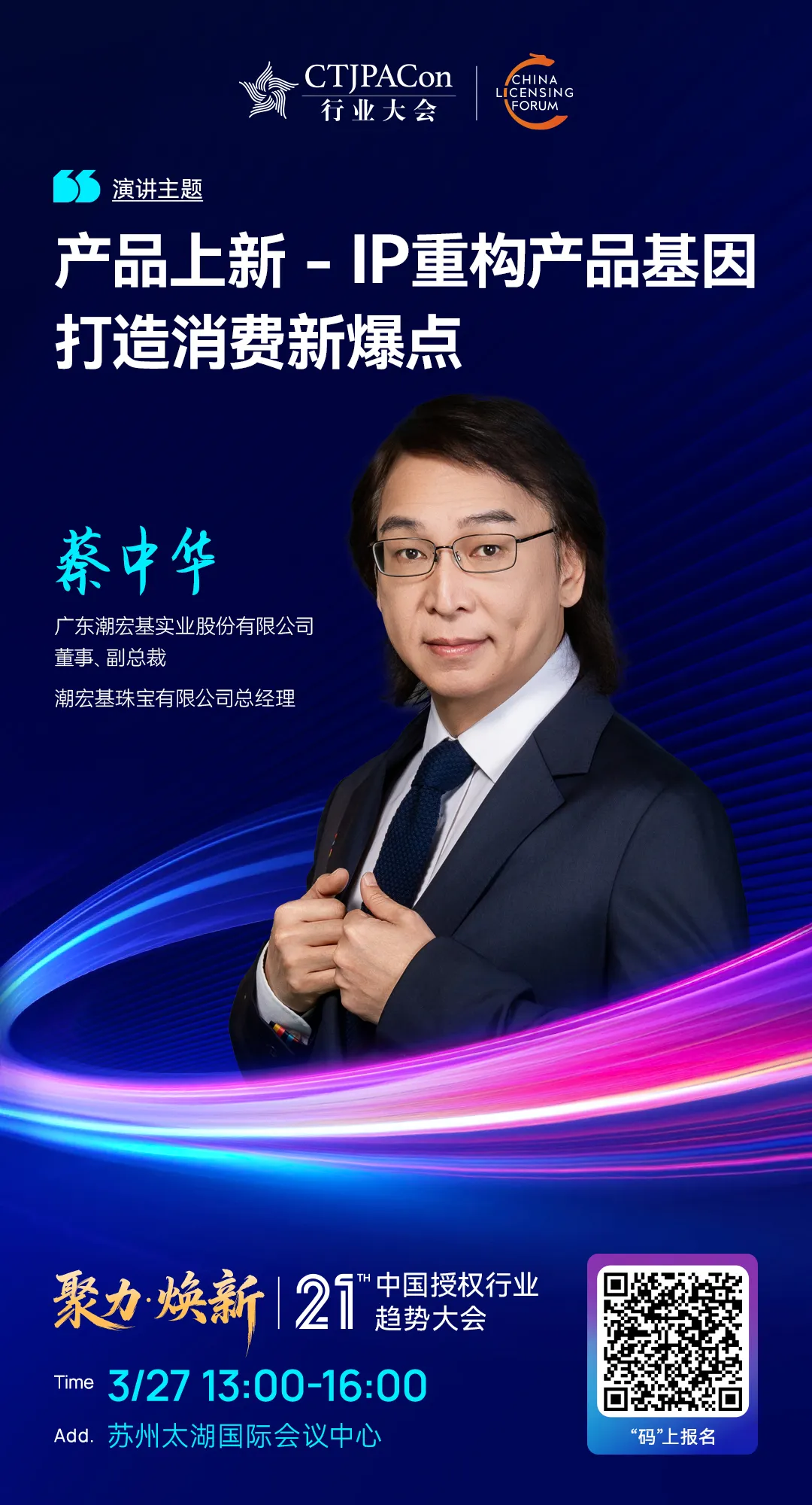 本次趋势大会,广东潮宏基实业股份有限公司董事、副总裁,潮宏基珠宝有限公司总经理蔡中华,将带来“产品上新–IP 重构产品基因打造消费新爆点”的主题分享。蔡中华将立足潮宏基多年产品创新与 IP 授权实战经验,从 IP 联名运营、非遗文化跨界打造、联动产品设计、消费场景创新等核心维度,拆解如何以 IP 为核心重构产品基因,分享珠宝联名爆款产品的打造逻辑,详解 IP 授权与珠宝产品的深度融合路径,为行业提供可落地的产品创新与 IP 商业化实践参考。