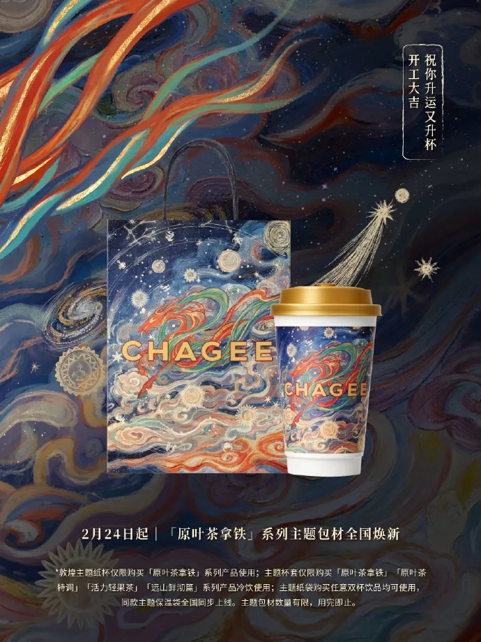 新茶饮品牌霸榜茶姬与敦煌博物馆携手开展联名合作,以“天马乘风、升运启新”为核心,推出原叶茶拿铁系列联名饮品及主题包材,同步上线升运贴纸、福包等周边。联名产品融合敦煌壁画天马、云气纹等元素,贴合春日开工场景与年轻群体审美,提出“开工第一杯”的宣传,和霸榜茶姬的国风品牌调性相契合,增强品牌的文化黏性和调性。