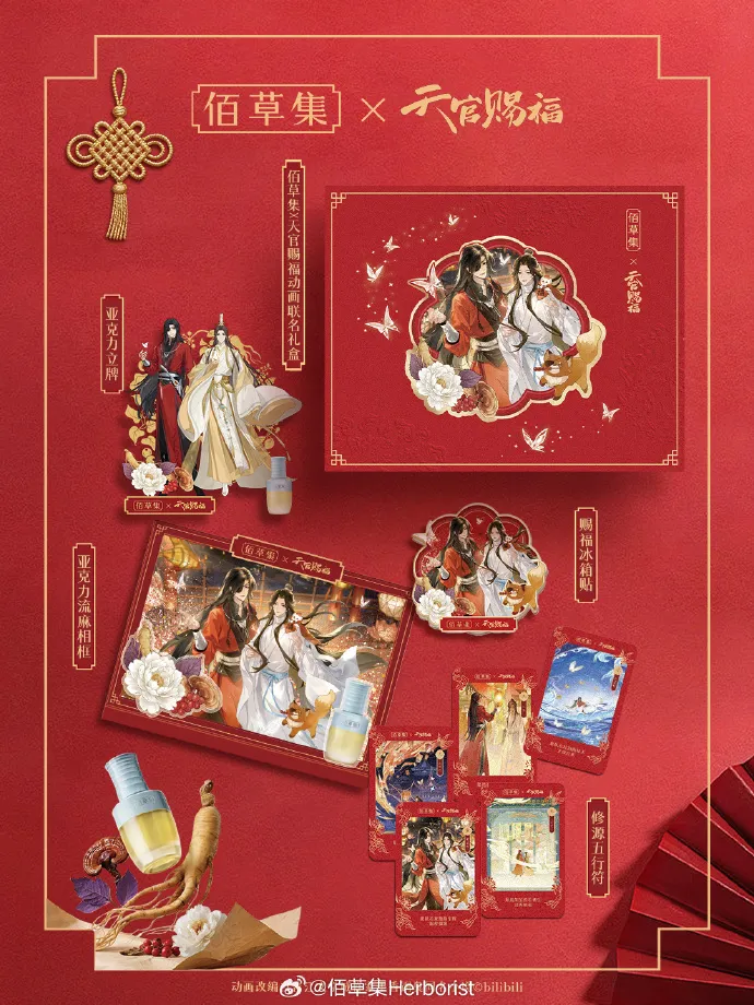 美妆品牌佰草集与国创《天官赐福》动画,携手开展联名合作,以“五行修源”为核心,推出联名限定礼盒及修源仙草油等产品,以及修源五行符、赐福冰箱贴、赐福冰箱贴、赐福冰箱贴等周边,同步上线限定红包皮肤,打造国风美妆场景化联动模式。联名产品融合古方护肤理念与 IP 意境,精准贴合国风年轻群体喜好,进一步深化了《天官赐福》的 IP 商业价值,提升品牌在年轻消费群体中的影响力。