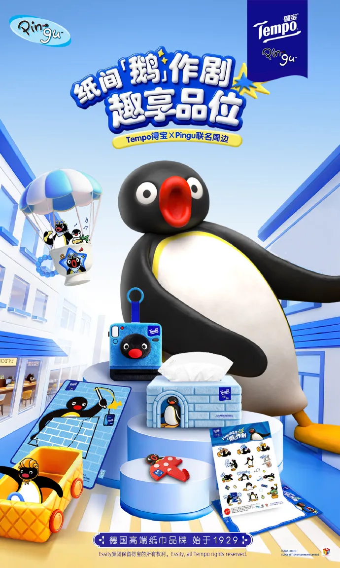 高端纸品品牌得宝与气萌系 IP Pingu 携手开展联名合作,推出 Pingu 定制印花款手帕纸、抽纸,同步上线毛绒软抽袋、贴纸、马克杯等周边。联名产品融合 Pingu 俏皮可爱的形象。贴合日常通勤、居家等场景,精准击中年轻群体的治愈需求,不仅助力得宝实现年轻化破圈,更拓宽了 Pingu IP 的生活场景渗透。
