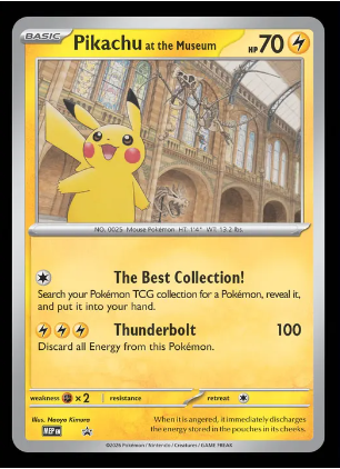 The oversized Pikachu at the Museum promo card will be included as a gift with purchase for in-store pop-up customers. Starting Jan. 30, the card will also be available as a gift with purchase at select U.K. retailers. The promo card will not be available through Pokémon Center.