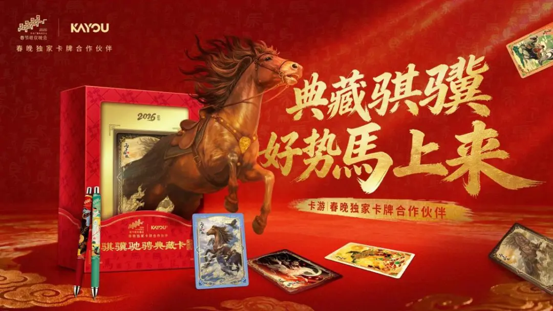 2 月 5 日,中央广播电视总台与卡游宣布达成合作,卡游成为《2026 年春节联欢晚会》独家卡牌合作伙伴,这是春晚首次设立该类别的独家合作席位。2026 年正值农历马年,卡游携手总台春晚创作的一系列蕴含祥瑞寓意的马年典藏卡牌,也将融入春晚的节目中。卡游是国内领先的泛娱乐产品企业,已形成覆盖卡牌、文具、毛绒等多品类的 IP 生态,推出《卡游三国》《哪吒之魔 童闹海》《戴敦邦红楼梦》等系列中国传统文化产品。