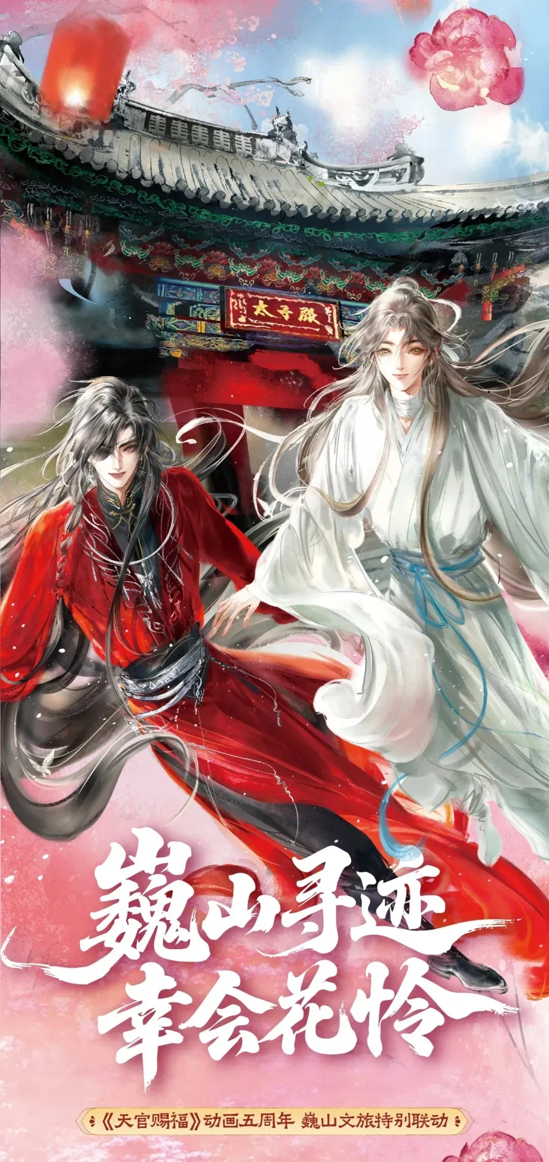 《天官赐福》动画携手云南省巍山文旅开启五周年特别联动,以国风 IP 赋能文化文旅发展。活动推出专属联动集章册与限定印章,印章巧妙融合巍山甲马纹样与动画经典元素,规划了巍宝山太子殿、南诏博物馆、梁家大院等特色打卡路线。游客可漫步巍山古城与巍宝山,解锁动画同款意境场景,参与集章互动,同时体验当地扎染、拓印等非遗技艺,实现经典国风 IP 与千年地域文化的双向赋能。