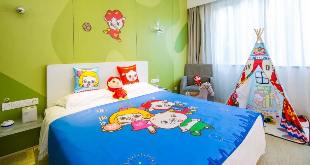 A:在这里想跟大家分享两个案例,第一个是猪猪侠亲子主题房,我们和广州的旅游平台“要出发周边游”联手打造亲子主题房,当时要出发看准了亲子家庭旅游市场,并迅速和有品牌积累、曝光率高的流量IP猪猪侠展开合作,IP流量和亲子家庭流量叠加,迅速抢占亲子酒店市场。猪猪侠亲子主题房间自上市后,由2018年的全国1000间,发展到今天主题房间超过3500间,成为国内亲子主题房间的标杆式案例。