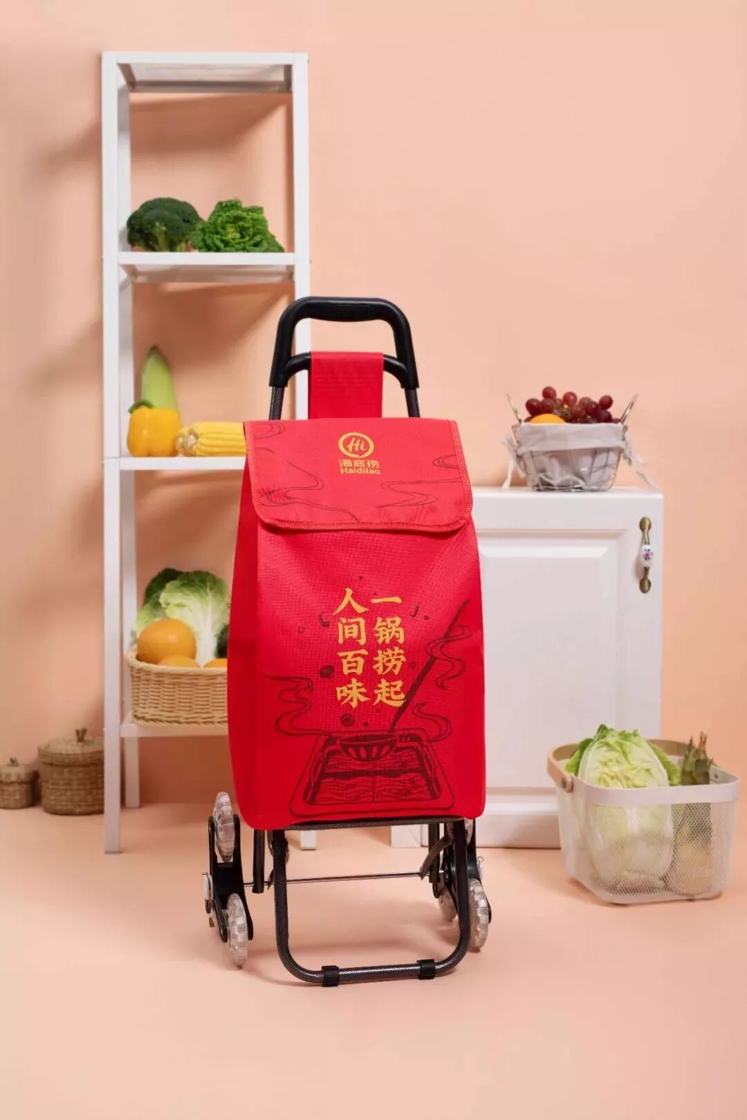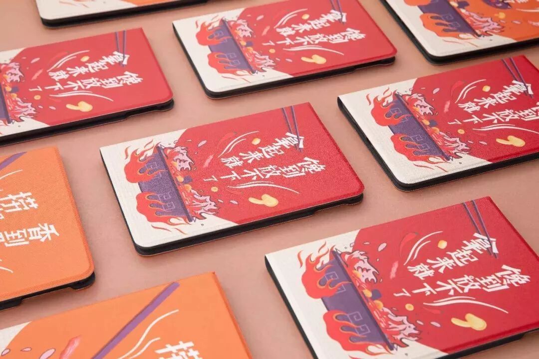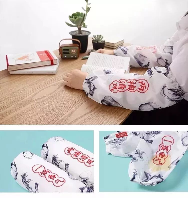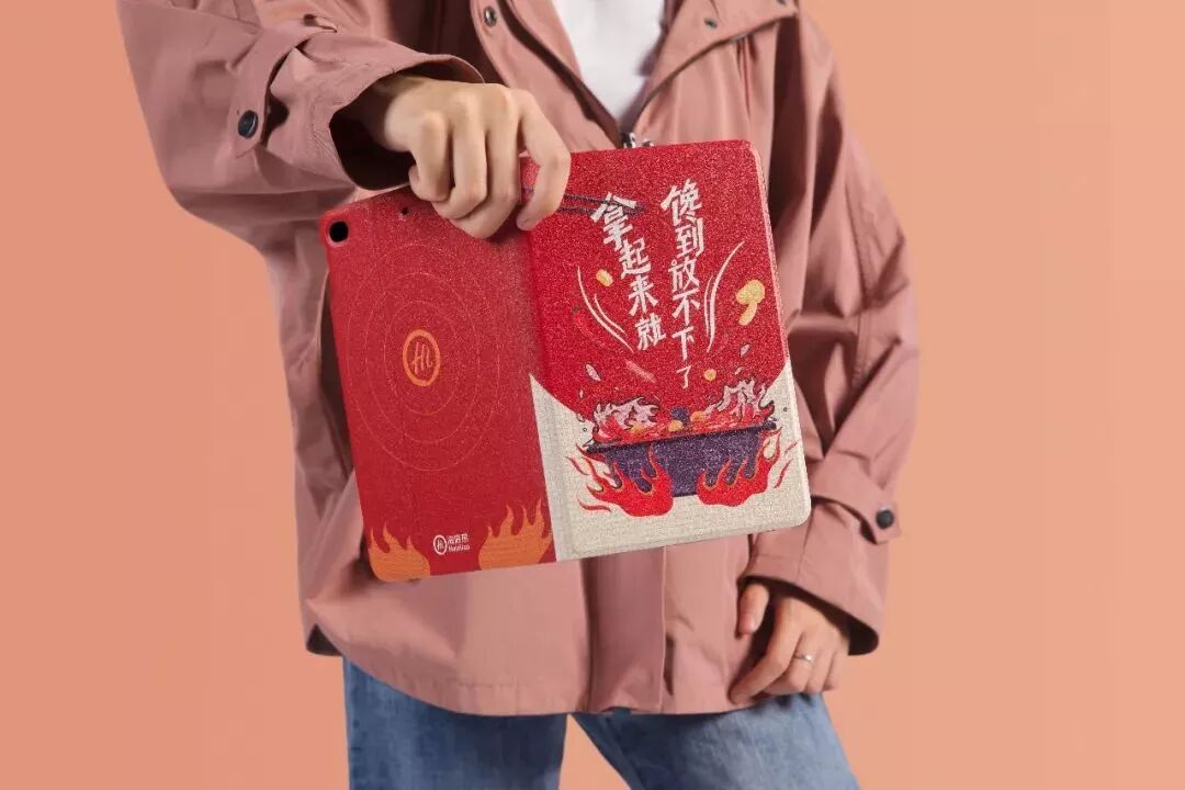 这些周边,不仅兼具实用性,在设计上和文案上,也充满了创意和社交属性。比如小推车上的文案:“一锅捞起,人间百味”。袖套的文案:“一锅香气,两袖清风”。ipad保护壳的文案“拿起来就馋到放不下了”,则是一语双关。非常符合当下年轻人的自我表达。