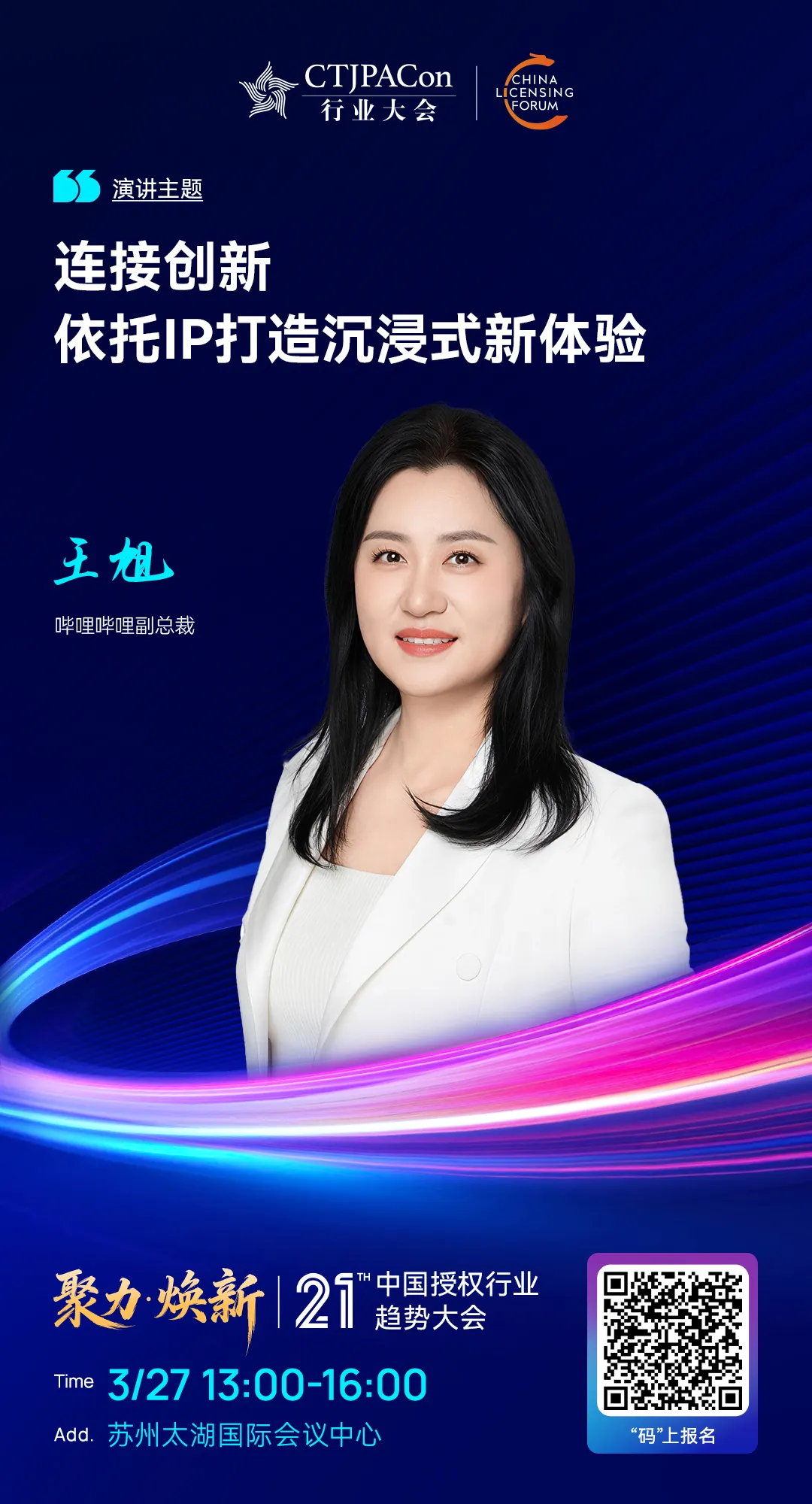 本次趋势大会,哔哩哔哩副总裁王旭将带来 “连接创新 - 依托 IP 打造沉浸式新体验” 的主题分享。王旭将立足 B 站丰富的 IP 生态、用户兴趣与全域运营实战经验,分享如何以连接为核心、以体验为抓手,打通线上与线下、内容与消费的全链路,为 IP 长效变现与行业破圈提供实战思路,助力更多企业激活 IP 商业新可能。