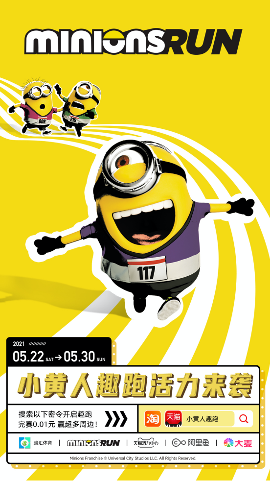 5月22日,由阿里影业旗下IP交易及创新平台阿里鱼携手天猫旗下泛运动人群线上互动阵地天猫活力中心,并联合环球影业、大麦体育共同举办的“小黄人趣跑”正式上线。活动期间,有近20万用户完成线上跑,在赢取本次活动专属“完赛证书”的同时,还获得了来自环球影业旗舰店和Wilson、361°、机械师、味动力等合作品牌带来的惊喜权益。