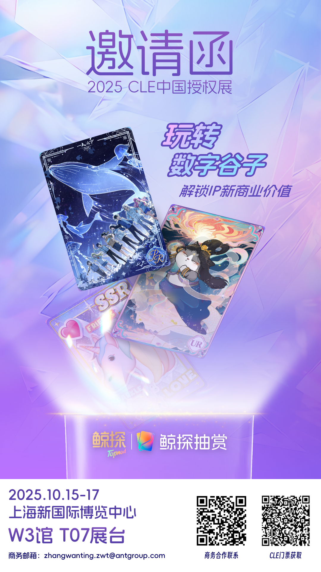10月15-10月17日CLE授权展,W3T07展位,欢迎莅临洽谈合作。鲸探抽赏期待与更多优质IP携手,共同探索数字周边的无限可能,挖掘IP价值变现新蓝海。在这个快速发展的赛道上前瞻布局,或将在未来的IP竞争格局中赢得先发优势。