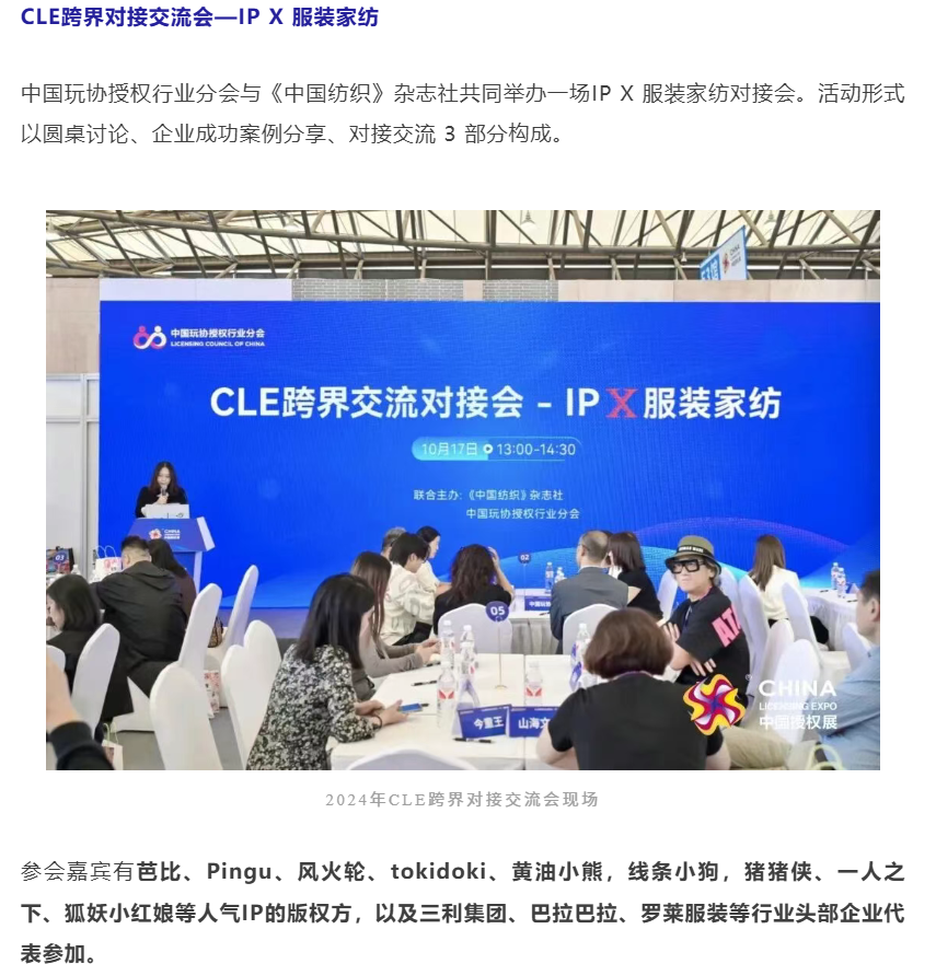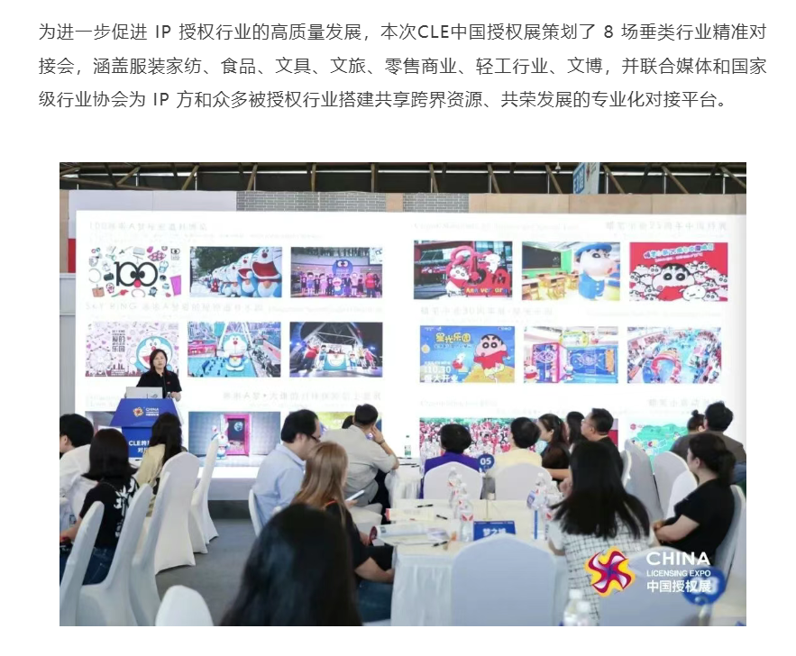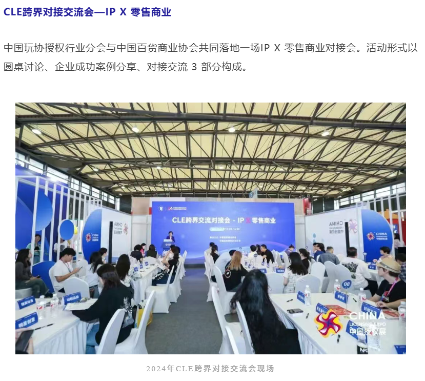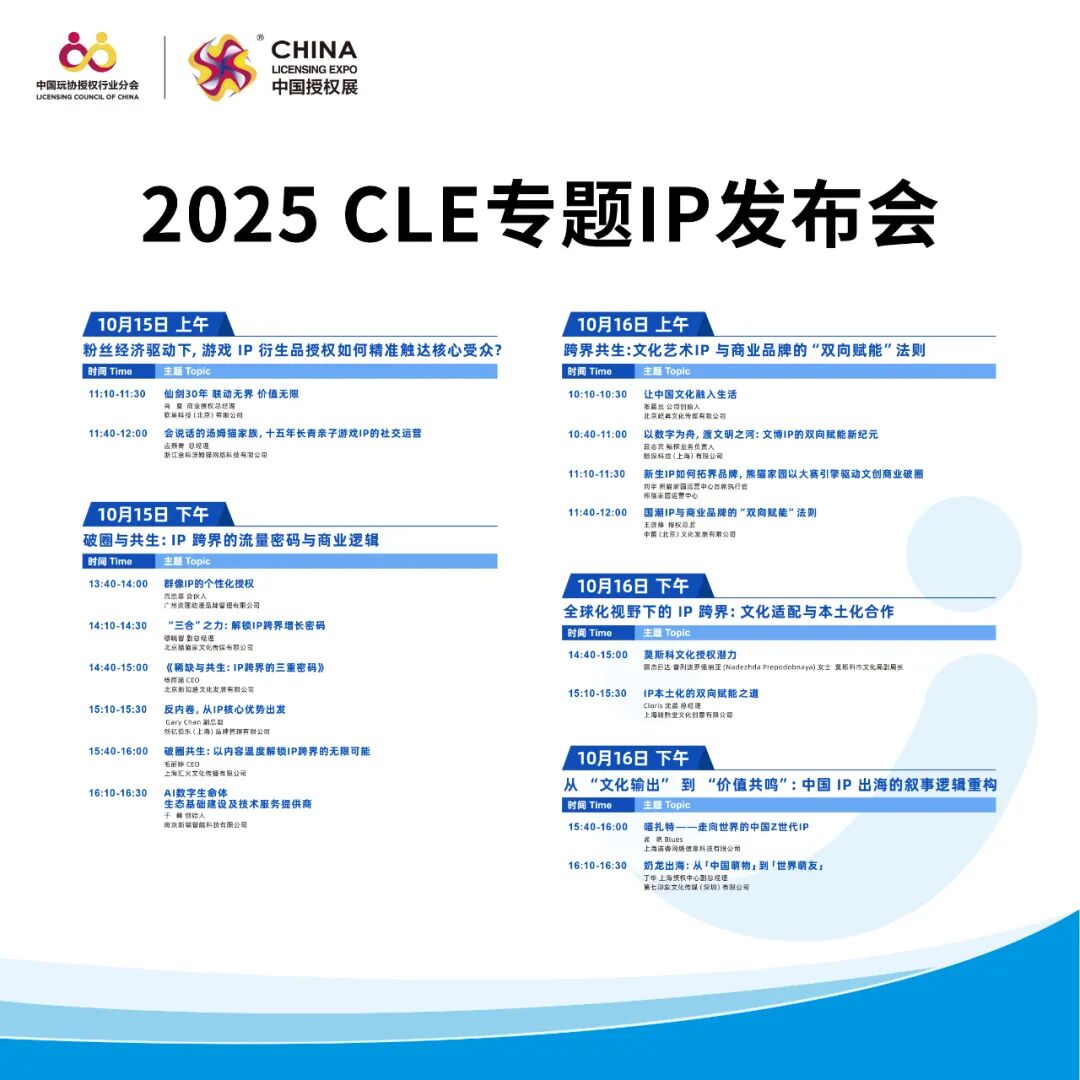 CLE 专题 IP 发布会邀请卡通动漫、潮流时尚、艺术文化、电子游戏等多元品类的 IP 授权企业高层,现场分享 IP 授权的前沿趋势、爆款打造策略等。