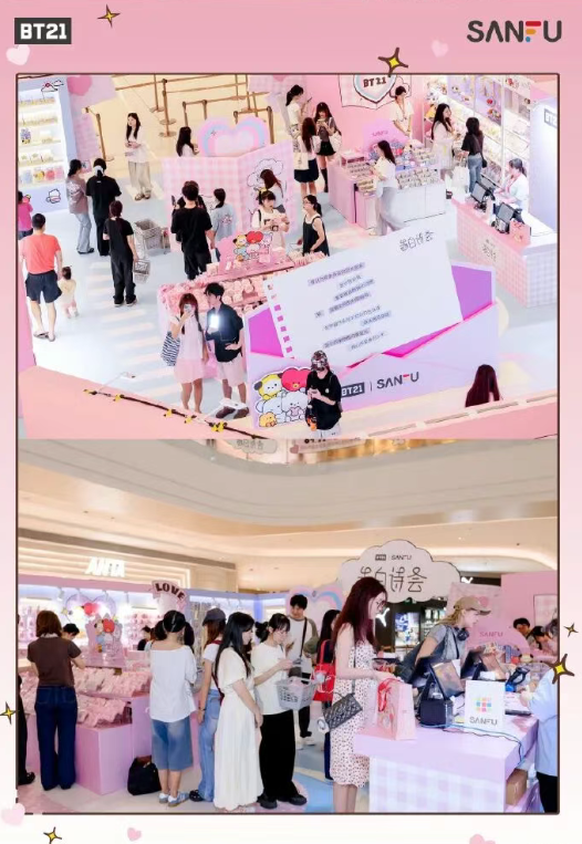 3 月 举办“春日闪亮” 主题联名快闪,打造了梦幻霓虹灯墙、巨型花朵秋千等沉浸式春日童话场景,为消费者提供了兼具观赏性和互动性的打卡点。7 月打造 “告白诗会” 主题联名活动,首发 BT21 告白诗系列新品,还设置了拼贴 DIY 专属告白诗、mini 扭蛋机等互动环节,并同步策划了特色痛巴联动宣传,环线免费接送粉丝到会场。