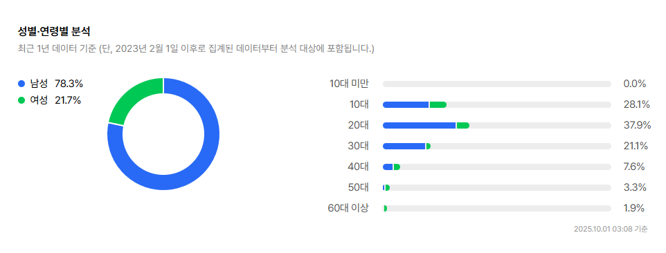 Gender Ratio: Male 78.3% / Female 21.7% → Predominantly male audience