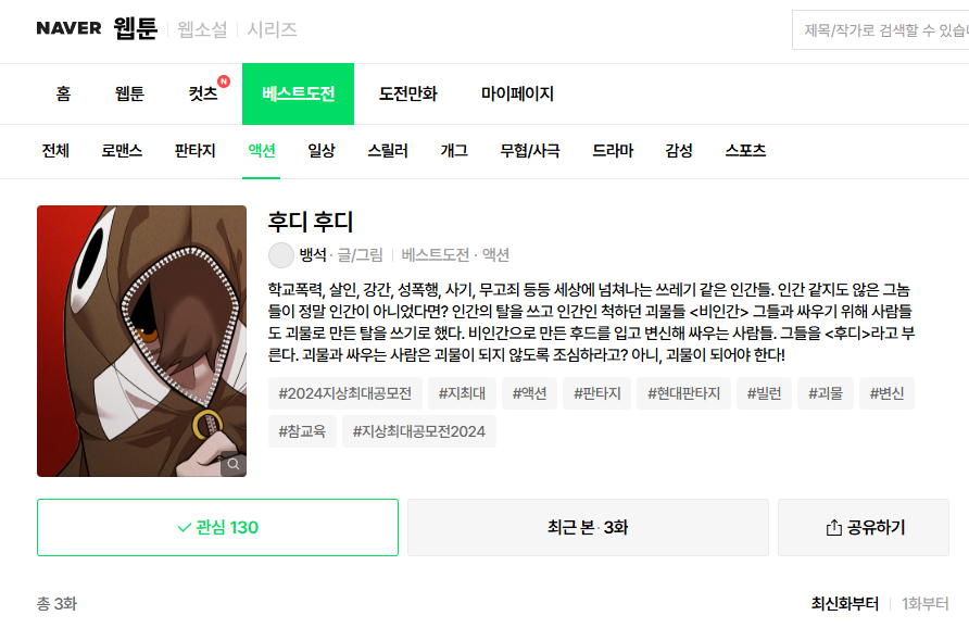 Hoody Hoody is a hero-action webtoon where criminals and inhumane people are revealed to be actual monsters, and ordinary people wear special hoodies that allow them to transform into monsters in order to fight back.