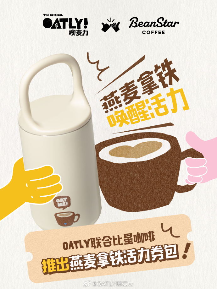 在与比星咖啡的跨界联动中,OATLY 不仅推出以 OATLY 燕麦奶为基底的限定咖啡饮品,还用联名电子券包的创新形式提升消费者的购买力,领取联名电子券即可优惠购买特调饮品。合作推出了限定版联名保温杯,融合比星咖啡桃心元素,用年轻化的设计触达年轻消费群体。双方还通过社交媒体矩阵联动宣传,发布联名海报,邀请 KOL 打卡分享,精准触达都市白领、学生等目标群体,放大品牌声量。