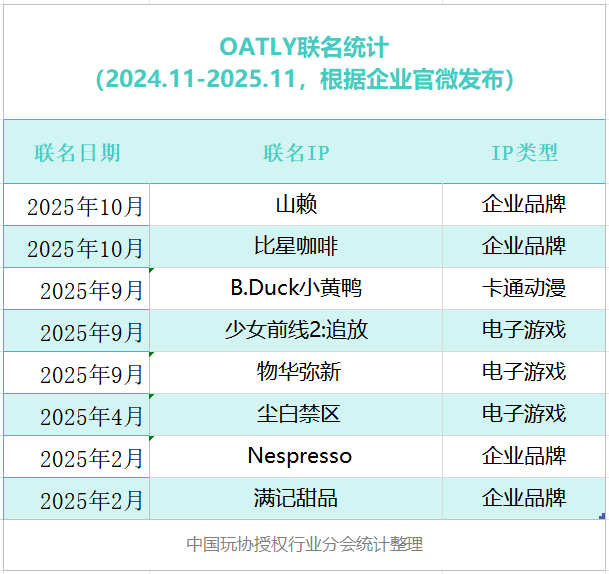 OATLY 今年营收实现增长并非偶然,而是源于其对联名逻辑的精准把控。OATLY 借助 B.Duck 小黄鸭的国民度降低本土消费决策门槛,靠《尘白禁区》等游戏 IP 穿透 Z 世代圈层,再通过与比星咖啡等理念共振的品牌合作巩固消费场景,成为外资品牌本土化的重要借鉴。OATLY 的联名实践也为小众品类破局提供了可量化的参考范式,通过 IP 联名快速积累用户,以圈层营销打开细分市场,用理念共鸣沉淀品牌价值,不断拓展品牌的影响力。