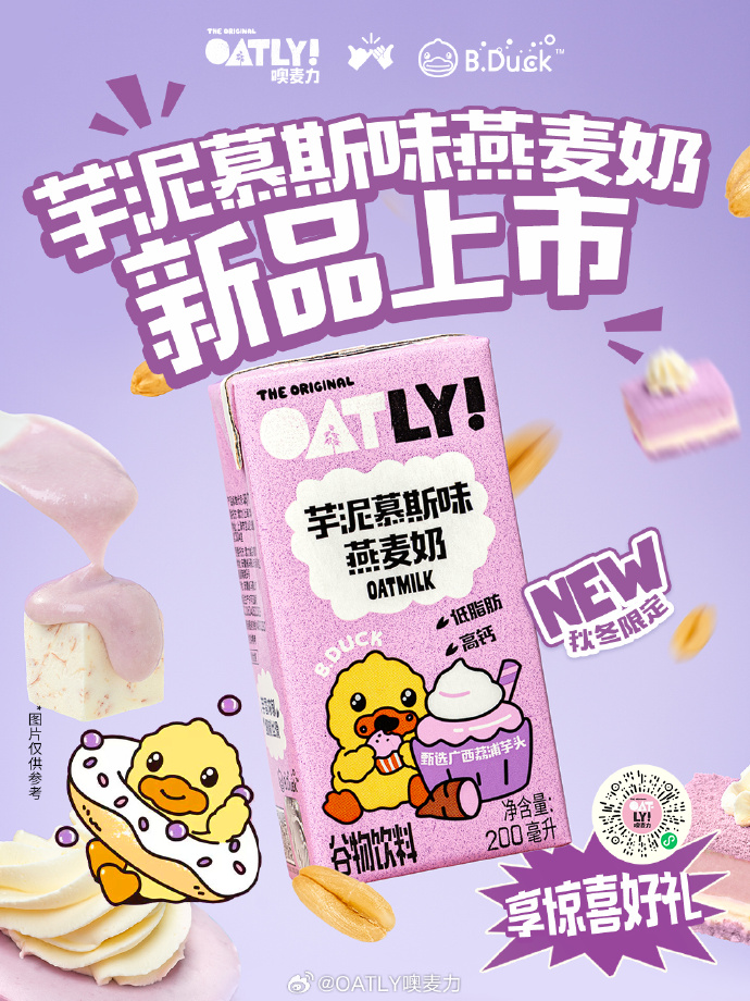 从 2024 年开始,OATLY 就开始了与 Duck 小黄鸭的长线系列合作,推出过香草冰淇淋味燕麦奶、绿豆沙燕麦奶、红枣燕麦奶等联名产品。还根据麦香、草莓、香蕉、巧克力口味,融合 B.Duck小黄鸭的 IP 元素,提出“麦力玩鸭”“没烦恼鸭”“不焦虑鸭”“太巧了鸭”的轻松宣传语,紧扣Z世代“悦己消费”心理,拓展本土的年轻消费群体。OATLY 与B.Duck小黄鸭方合作既让 OATLY 摆脱国外品牌疏离感,又以 B.Duck小黄鸭的国民度降低消费决策门槛,激活了 IP 在快消产品上的强大价值。